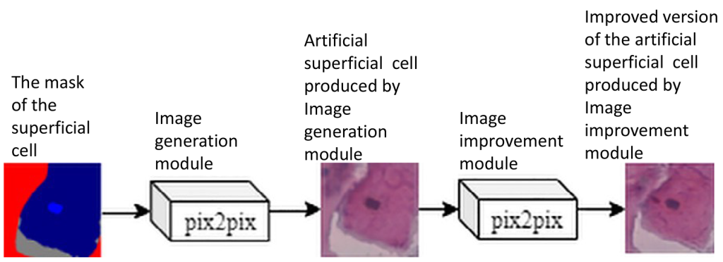 Generative Adversarial Networks (GANs) create artificial images that are challenging to distinguish from the real ones used during training. Incorporating these artificial images into the training process of Convolutional Neural Networks (CNNs) for detecting, segmenting, or classifying objects in images enhances model training and ultimately improves inference performance. This is especially crucial in the case of medical image analysis, which is subject to strict legal and ethical regulations. The paper proposes a two-step artificial image synthesis method based on the pix2pix network architecture. Validated on cervical smear cell classification dataset, the proposed method demonstrated boost in performance, particularly in classification accuracy.