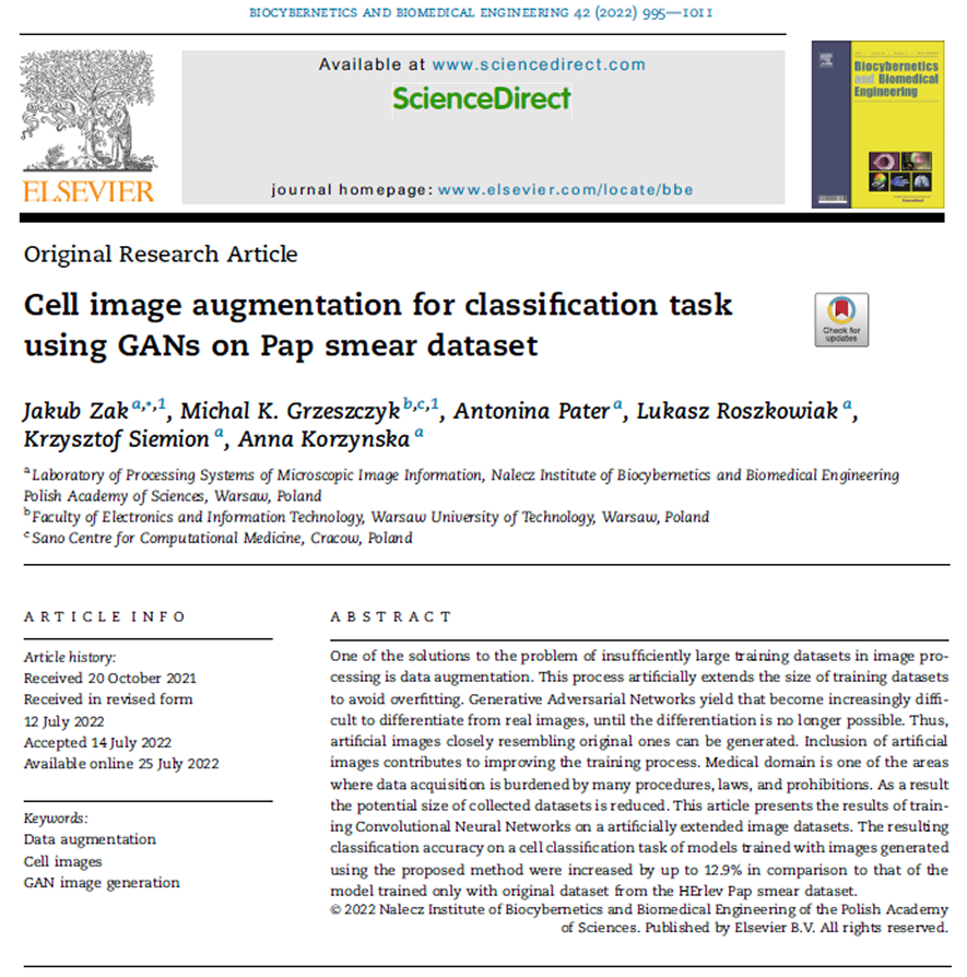 1. Jakub Zak, Michal K. Grzeszczyk, Antonina Pater, Lukasz Roszkowiak, Krzysztof Siemion, Anna Korzynska (2022) „Cell image augmentation for classification task using GANs on Pap smear dataset”, Biocybernetics and Biomedical Engineering 42(3), pp 995-1011; DOI:10.1016/j.bbe.2022.07.003 [IF 5,667; 140 points MNiSW].