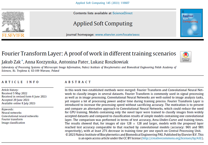 1. Jakub Zak, Anna Korzynska, Antonina Pater, Lukasz Roszkowiak (2023) „Fourier Transform Layer: A proof of work in different training scenarios” Applied Soft Computing, 145, 110607. DOI: 10.1016/j.asoc.2023.110607 [IF 8.7; 200 points MNiSW].