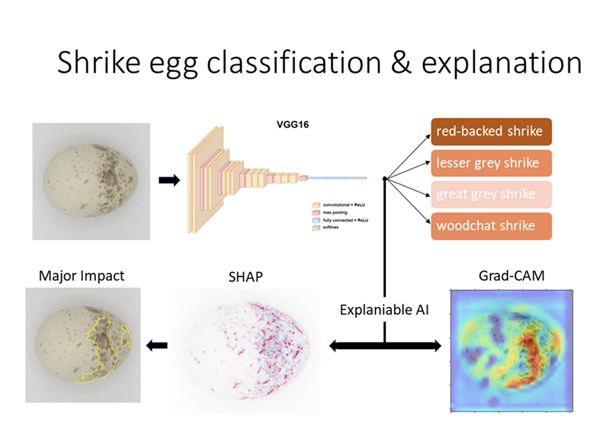 This study applies Explainable AI to analyze pigmentation patterns on bird eggs, focusing on the genus Lanius, which exhibits high intra-species variability. Using CNNs, the research achieved over 95% accuracy in species classification. To uncover species-wide identification signatures, Grad-CAM and SHAP deep explainers were applied, though they primarily highlighted general trends rather than specific discriminative features. This method enhances museum collection organization, species verification, and oological study accuracy while also offering insights into avian evolution, ecological strategies, and potential biomedical applications.