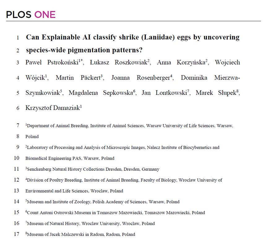 1. Paweł Pstrokoński, Lukasz Roszkowiak, Anna Korzyńska, Wojeciech Wójcik, Martin Packert, Joanna Rosenberger, Dominika Mierzwa-Szymkowiak, Magdalena Seplowska, Jan Lontkowski, Marek Słupek, Krzysztof Damaziak (2025) “Can Explainable AI classify shrike (Laniidae) eggs by uncovering species-wide pigmentation patterns?” PLOS ONE accepted, [IF 2.9; 100 p. MNiSW].