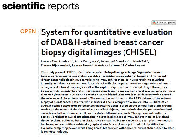 1. Lukasz Roszkowiak, Anna Korzynska, Krzysztof SiemionJakub ZakDorota PijanowskaRamon Bosch, Marylene Lejeune & Carlos Lopez (2021) “System for quantitative evaluation of DAB&H-stained breast cancer biopsy digital images (CHISEL)”, Sci Rep 11, 9291 (2021). DOI: 10.1038/s41598-021-88611-y  [IF 4.380, 140 points MNiSW].