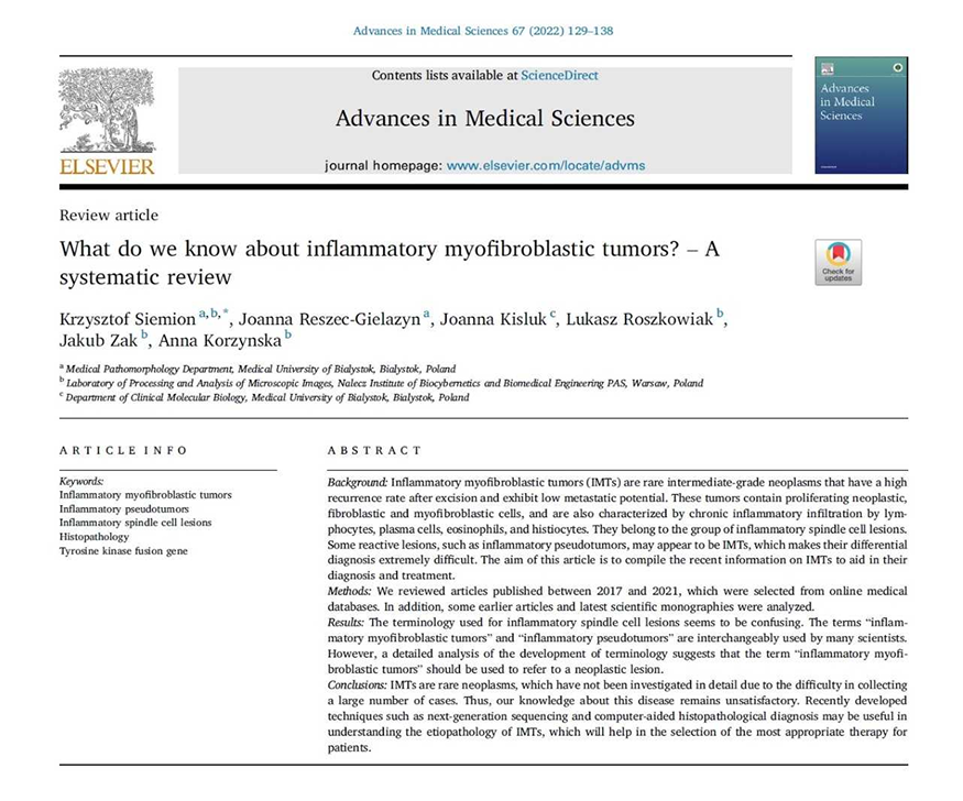 1.  Krzysztof Siemion, Joanna Reszec-Gielazyn, Joanna Kisluk, Lukasz Roszkowiak, Jakub Zak, Anna Korzynska: „What do we know about inflammatory myofibroblastic tumors? - A systematic review” Advances in Medical Sciences 67 (1), 2022 pp.129-138 DOI: 0.1016/j.advms.2022.02.002, [IF 2,852, 100pt ].