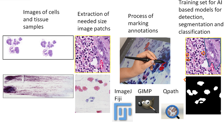 A significant limitation in computer-assisted diagnostic systems for pathology is the high cost of data annotation. Evaluating tissue (histopathological) and cellular (cytological) specimens presents a complex challenge. To streamline the labor-intensive process of collecting a sufficiently large dataset, various systems: GIMP, QuPath, ImageJ can be utilized for image annotation.