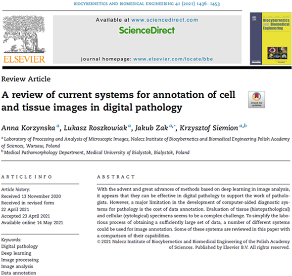 1. Anna Korzynska, Lukasz Roszkowiak, Jakub Zak, Krzysztof Siemion (2021) “A review of current systems for annotation of cell and tissue images in digital pathology” Biocybernetics and Biomedical Engineering vol 41, pp 1436-1453 [IF 4.314; 140 pts MNiSW].