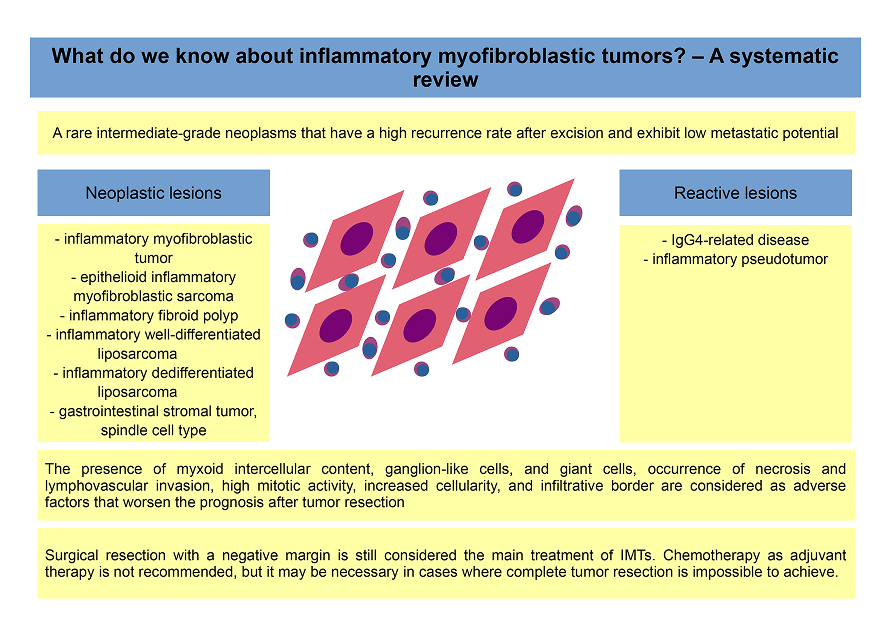 This systematic review explores the current understanding of inflammatory myofibroblastic tumors (IMTs), rare mesenchymal neoplasms with variable clinical behavior. It summarizes key findings related to their pathogenesis, histopathological features, diagnostic challenges, and treatment strategies. The review also highlights recent advances in molecular genetics, particularly ALK gene rearrangements, which have important diagnostic and therapeutic implications.