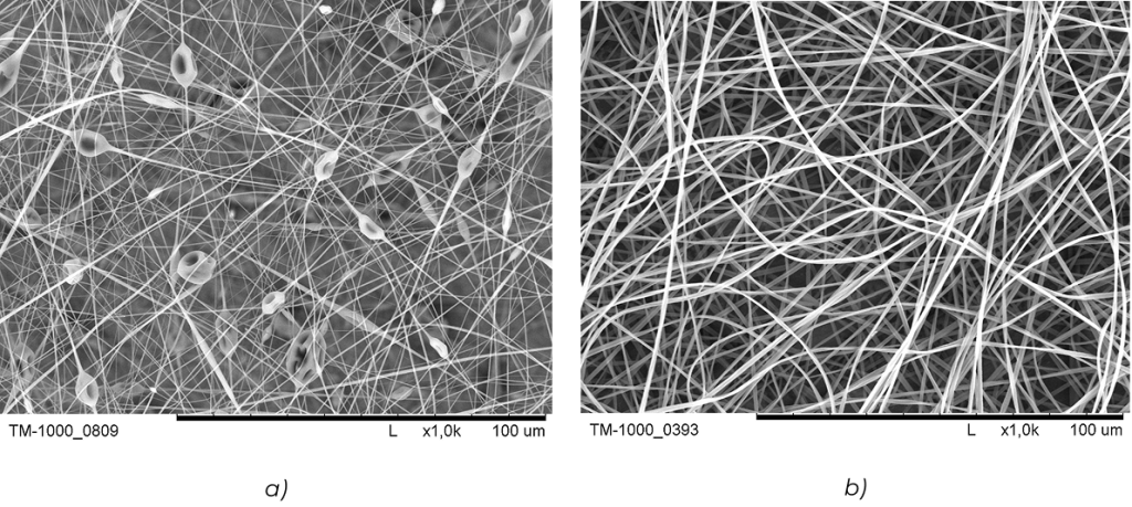 - influence of selected electrospinning process parameters (voltage, polymer solution flow rate and polymer solution viscosity) on fibre thickness and the ability of the system to produce bead-on-string (Fig. 1a ) and homogeneous (Fig. 1b) nonwovens.