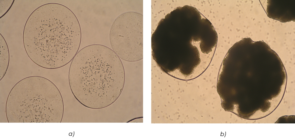 Rys. 5. Sferyczne mikromatryce polimerowe wytworzone z: a) polimeru syntetycznego Mirek et al. Colloids and Surfaces A: Physicochemical and Engineering Aspects 2022; b) polisacharydu zawierające immobilizowane komórki ludzkich przytarczyc.