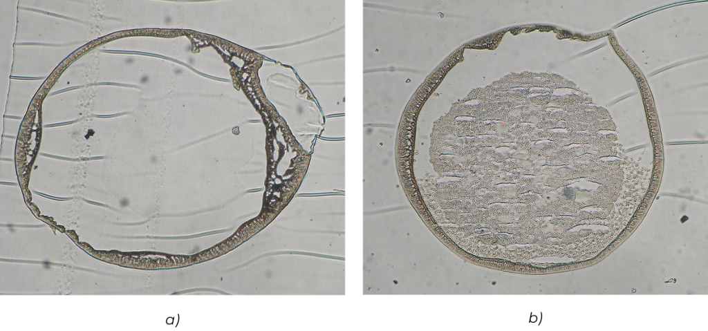 Rys. 9. Wnętrze mikrokapsułek AP zawierających enkapsulowane drożdże piekarskie: (a) przed i (b) po 24 godz. hodowli.
