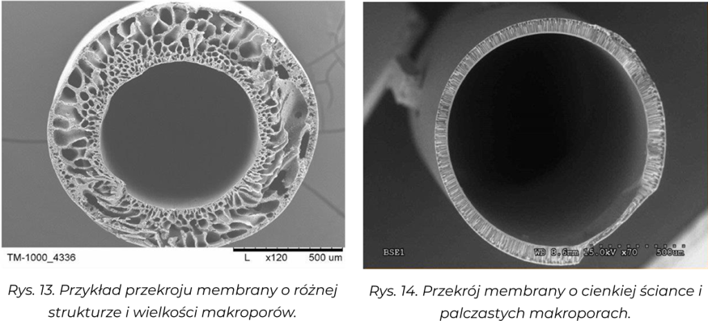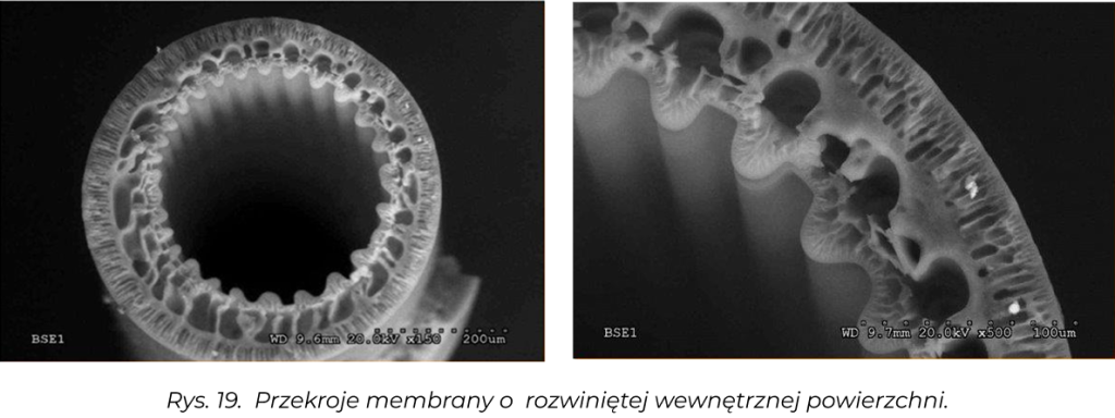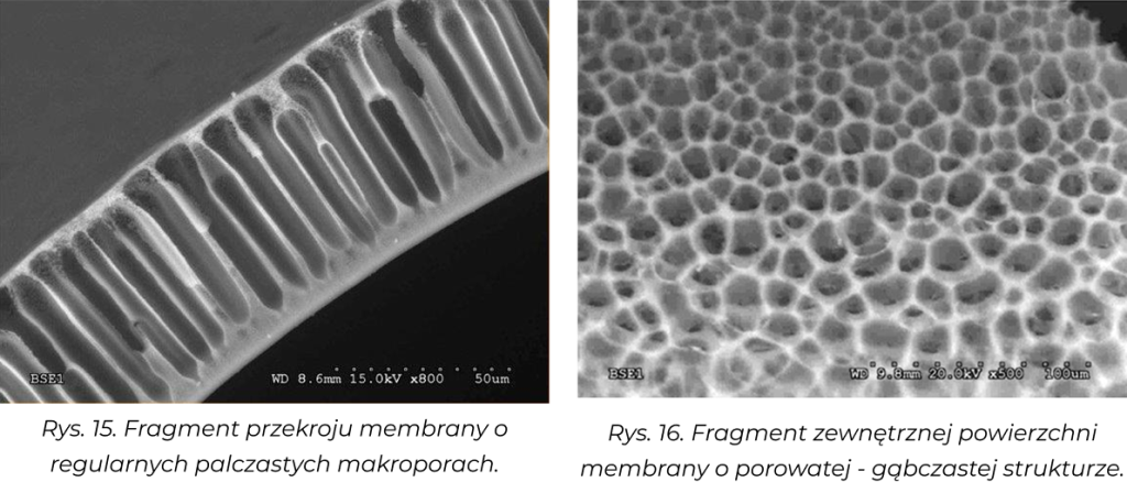Transport and separation properties membran takie jak przepuszczalność hydrauliczna (współczynnik ultrafiltracji UFC), retencje (wyznaczanie punktu odcięcia) oraz porowatość struktury membran określana za pomocą analizy zdjęć SEM [9-11], przeprowadzonej z użyciem opracowanego w naszym Instytucie programu komputerowego MeMoExplorerTM [12].