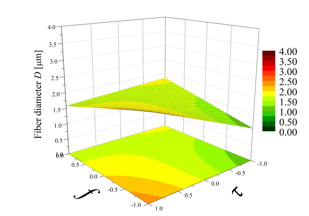 Fig. 2. Example result of a factor analysis: surface plots showing the effect of the polymer solution flow rate Q (in the range 0.6-1.2 ml/h) and the viscosity of this solution µ (in the range 0.043-0.107 Pa*s) on the fibre thickness D for homogeneous nonwovens produced at different voltage values U. Korycka et al. Beilstein J. Nanotechnol. 2018.