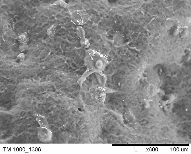 Electron microscope view of a nano-thin polyelectrolyte layer on a slide with adherent WEHI cells 164