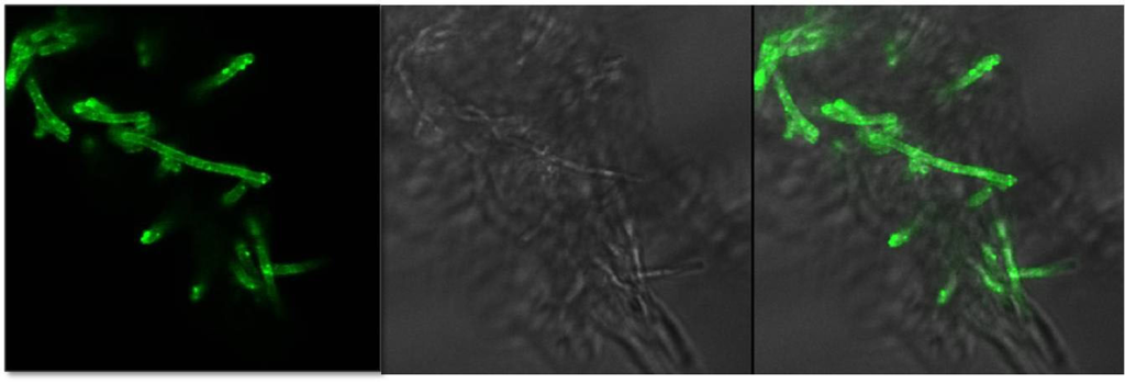 Confocal microscope view of bacterial cells nanoencapsulated in a transferrin-incorporated coating with an attached fluorochrome-labelled antibody directed against transferrin.