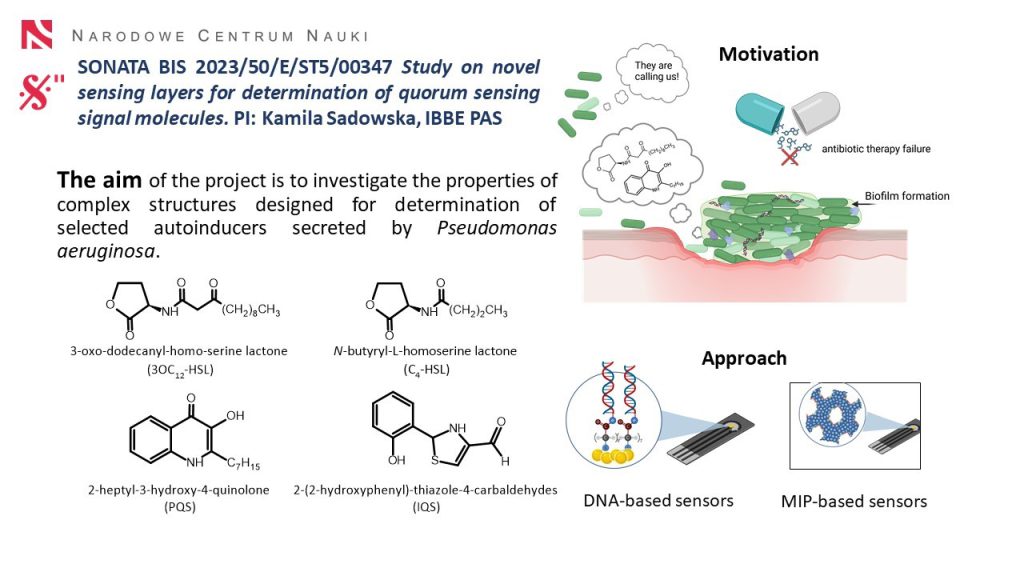 Sonata bis 2023/50/E/ST5/00347 „Badania nad nowymi czułymi warstwami do oznaczania cząsteczek sygnałowych quorum sensing”. Kierownik projektu: dr hab. inż. Kamila Sadowska, prof. IBIB.