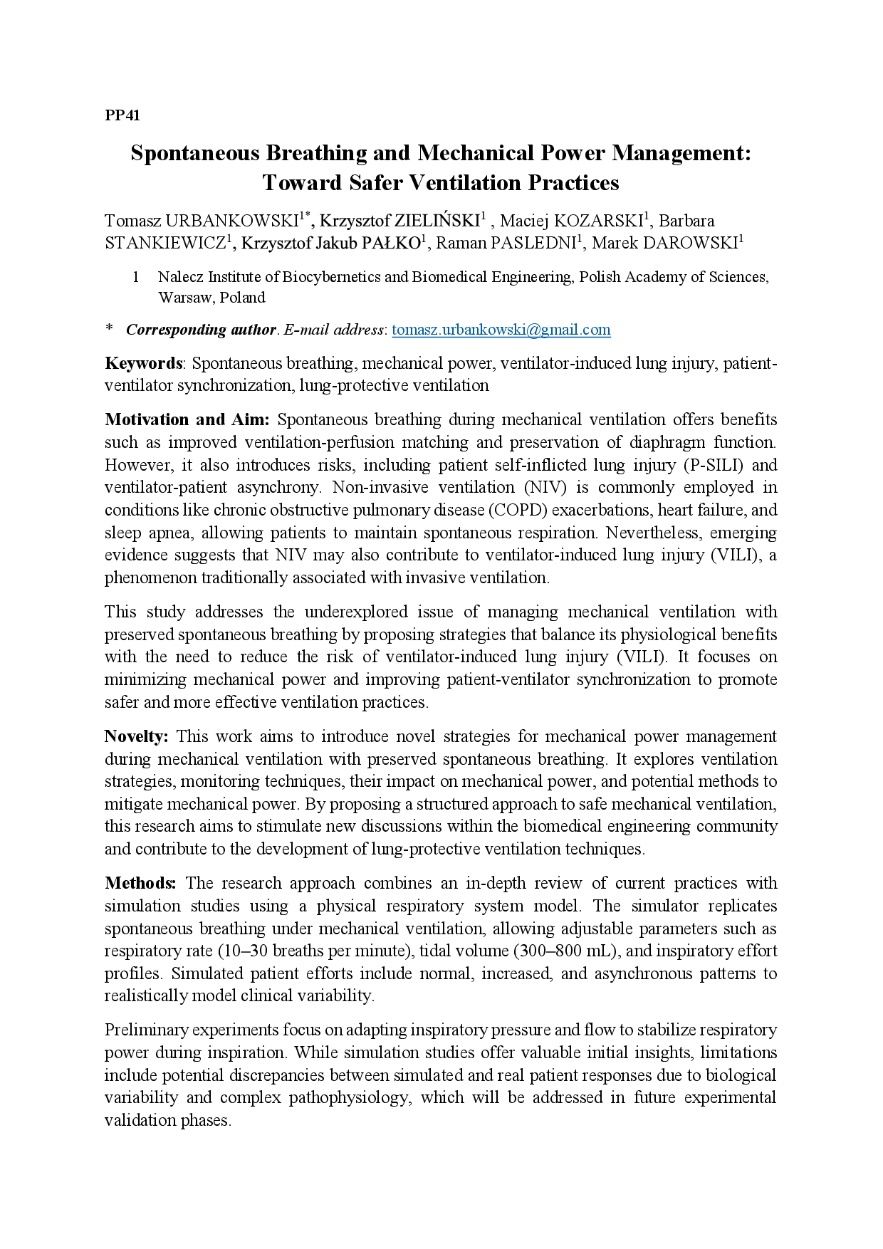 1. Urbankowski Tomasz, Kozarski Maciej, Stankiewicz Barbara, Pasledni Raman, Darowski Marek. Spontaneous Breathing and Mechanical Power Management: Toward Safer Ventilation Practices. Book of Abstracts (P41) of NBC 2025 & PCBBE 2025, June 16-18, 2025, Warsaw, Poland.